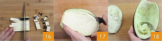 A partir del corte en bastones, puedes realizar el corte en dados, para preparar pastas o risottos: coloca en orden los bastones que has formado y luego córtalos a lo ancho. El tamaño de los dados varía según la preparación: 1 cm es ideal para pastas o risottos 16. Si deseas preparar tu berenjena rellena, divídela por la mitad a lo largo o ancho según tus preferencias e incide la pulpa con un cuchillo pequeño, dejando 1 cm de borde desde la piel 17. Luego excava la pulpa con una cuchara 18.