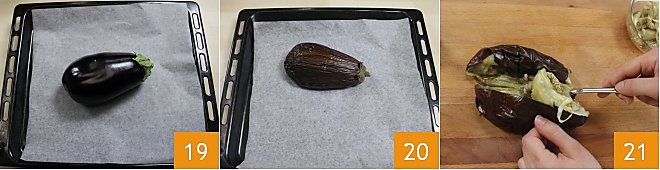 Para hacer albóndigas o caviar de berenjenas, por ejemplo, es necesario excavar la pulpa después de haber cocido al horno la berenjena. Cubre entonces una bandeja con papel de horno y coloca encima la berenjena entera después de haberla lavado 19. Cocina en el horno por un tiempo que varía según la preparación, hasta que alcance una consistencia blanda y tostada 20. Una vez cocida, ábrela por la mitad y retira la pulpa ayudándote con una cuchara 21.