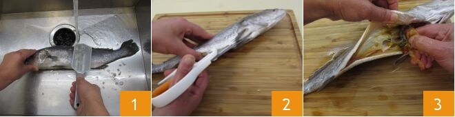 Para limpiar y filetear la corvina, primero toma la corvina y procede a desescamar el pescado con el utensilio desescamador o alternativamente con la hoja de un cuchillo 1. Frota el desescamador pasándolo desde la cola a lo largo de todo el cuerpo del pescado hasta llegar a la cabeza. Repite la operación hasta que obtengas un pescado totalmente desescamado. Es recomendable realizar esta operación bajo abundante agua corriente para favorecer el desprendimiento de las escamas del cuerpo y evitar ensuciar la superficie de trabajo. La operación de desescamado debe realizarse para todas las preparaciones de la corvina excepto cuando se cocina a la plancha o en costra de sal. Luego coloca la corvina sobre una tabla de cortar y con unas tijeras realiza un corte en el vientre del animal a lo largo de toda su longitud 2. Verás las vísceras en el vientre: remuévelas con las manos 3.