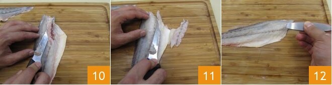 Ayudándote con un cuchillo pequeño, elimina las nervaduras rojizas situadas en la parte central de cada filete 10. Retira ahora con cuidado las espinas evidentes del vientre del pescado con un cuchillo 11 teniendo cuidado de no romper la carne. Procede eliminando las espinas restantes con unas pinzas adecuadas 12. Tus filetes de corvina están ahora listos para ser utilizados.