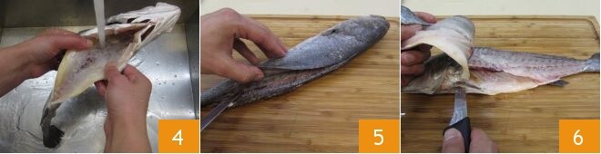 Lava cuidadosamente el vientre del pescado para quitar el sabor amargo 4. Luego pasa al fileteado de la corvina: con un cuchillo de hoja afilada, corta el dorso del pescado, siguiendo la línea de las aletas dorsales 5. El corte debe hacerse en profundidad, hasta la espina del pescado para poder separar la carne de la espina central 6.