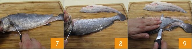 Luego procede separando el filete de la cabeza del animal 7 haciendo un corte limpio a la altura de las branquias. Para esta operación es preferible inclinar ligeramente el cuchillo 8. Luego procede con el otro lado del pescado para obtener la segunda mitad del filete separando la carne de la espina 9.