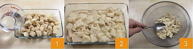 Para preparar los mejillones rellenos, empieza a remojar el pan en agua: coloca la miga del pan sin corteza (o bien coloca el pan con la corteza que luego eliminarás) en un bol con aproximadamente medio litro de agua. Deja la miga en agua hasta que esté blanda 2. Mientras tanto, pica el perejil y el ajo para después. Escurre bien la miga, colocándola en un colador y presionándola con el dorso de una cuchara 3.