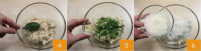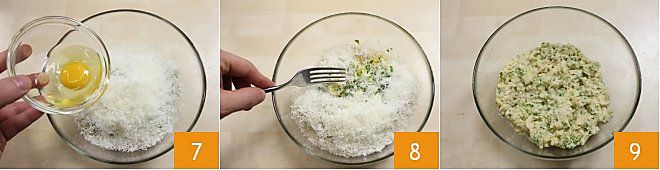 luego la sal, la pimienta y el huevo 7. Amasa los ingredientes con las manos o con un tenedor 8 para obtener una masa compacta y homogénea que dejarás aparte 9.