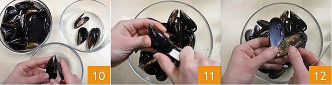 Ahora hay que abrir los mejillones crudos, que ya habrás raspado de impurezas (Cómo limpiar y abrir los mejillones): aprieta ligeramente la concha del molusco con los dedos, para que las valvas se abran ligeramente; luego, comenzando desde el lado del mejillón que presenta una protuberancia, introduce la punta de un cuchillito orientada hacia abajo, para cortar el músculo 10. En este punto, gira alrededor del molusco con el cuchillito 11, cuidando de tener la hoja siempre orientada hacia abajo, y abre el mejillón 12 sosteniendo el fruto solo de un lado.
