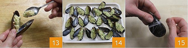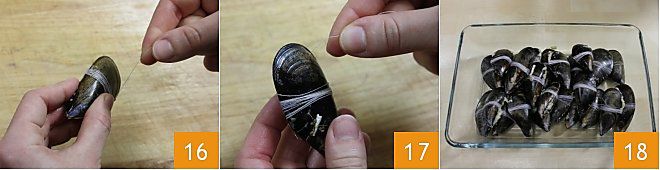 Una vez fijado, pasa el hilo por el mejillón y tira hacia abajo para fijar el cierre (16-17). Recuerda eliminar todos los excesos de relleno antes de cocinar los mejillones para no ensuciar la salsa 18.