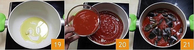 En una olla alta y estrecha, que permita que los mejillones estén completamente sumergidos en la salsa, ponemos un diente de ajo y aceite de oliva virgen extra 19; deja que se dore el aceite y añade la salsa de tomate 20. Tan pronto como la salsa empiece a hervir, añade los mejillones uno a uno con delicadeza y deja cocinar, con tapa, a fuego bajo durante unos 15/20 minutos 21. ¡Los mejillones rellenos estarán listos para disfrutar: sácalos de la salsa y sírvelos en la mesa! Para cortar el algodón, usa un cuchillito o unas tijeritas; ¡la salsa podrás usarla para condimentar la pasta!