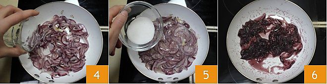 Cuando la cebolla empiece a freír, añada el agua 4, deje que se absorba un poco y luego añada también el azúcar 5. Deje que se absorba toda el agua y que el azúcar se caramelice ligeramente 6, tardará unos diez minutos, luego retire del fuego y reserve las cebollas.