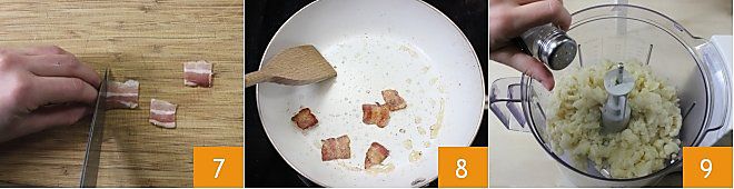 Corte cada loncha de panceta en 3 trozos de un centímetro y medio de ancho 7 y dórela en la sartén por unos segundos a fuego alto con un poco de aceite 8, cuando la panceta esté crujiente, apague el fuego y resérvela. En la batidora, ponga la coliflor ya fría, salpimiéntela, añada la pimienta 9