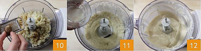 y añada también la nuez moscada 10. Triture todo durante unos instantes y luego añada también la nata 11 y triture hasta obtener una consistencia cremosa 12.