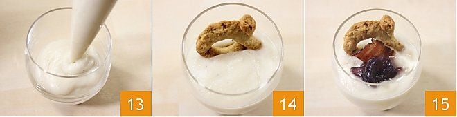 Ahora componga los vasos: transfiera la crema de coliflor a 12 vasitos (si quiere, puede hacer esta operación con una manga pastelera), 13 y decore cada vaso con un torcello 14, una lonchita de panceta crujiente y la cebolla caramelizada 15. ¡Aquí está, la crema de coliflor con torcello está lista para ser servida!
