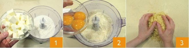 Para preparar la tarta de frutas de verano, comienza con la masa quebrada: en un procesador de alimentos coloca la harina, el azúcar glas y la mantequilla cortada en trozos fríos de la nevera 1 y mezcla; cuando obtengas unas migas finas como arena, añade también las yemas 2. Al seguir mezclando se formarán migas mucho más grandes: en este punto transfiere la mezcla a una superficie de trabajo y amasa 3 hasta obtener un compuesto homogéneo y compacto.
