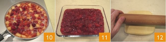 Cocina a fuego lento 10 hasta que la fruta se haya ablandado y secado (unos 20 minutos), luego transfiérela a una fuente y déjala enfriar 11. Mientras tanto, extiende la masa con la ayuda de un rodillo 12,