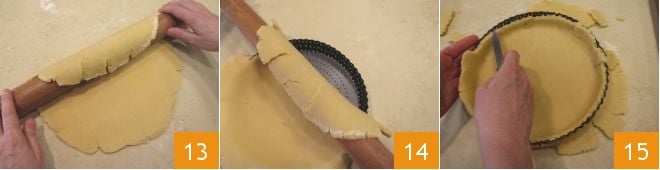 hasta obtener un grosor de aproximadamente medio centímetro 13, cubre con ella un molde de 24 cm de diámetro 14, luego elimina el exceso de masa con un cuchillo 15 y resérvalo porque servirá para formar las tiras.