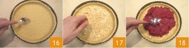 Pica la superficie de la masa con las púas de un tenedor 16, desmenuza encima los bizcochos de soletilla 17, que ayudarán a absorber los líquidos liberados por la fruta durante la cocción, y cubre con la mezcla de frutas 18, extendiéndola uniformemente,