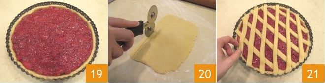 hasta cubrir toda la superficie 19. Forma tiras con la masa quebrada sobrante 20 y colócalas cruzadas sobre la tarta 19, formando rombos.