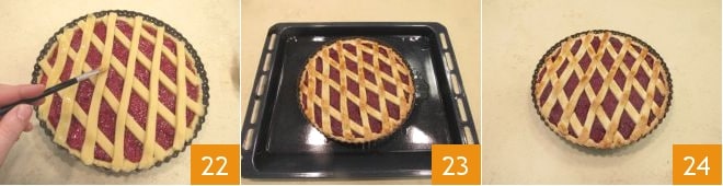 Bate un huevo y pincela las tiras de masa 22, luego hornea en un horno estático precalentado a 180° durante unos 40 minutos. Déjala enfriar sobre una rejilla 23 y tu tarta de frutas de verano está lista para ser servida 24!