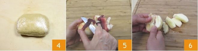 Forma un bloque 4, envuélvelo en film transparente y ponlo en la nevera durante al menos media hora. Mientras tanto, lava y pela los melocotones 5, córtalos en rodajas y luego en trozos 6,