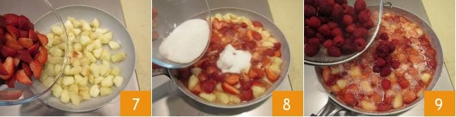 luego colócalos en una sartén junto con las fresas limpias 7. Añade el azúcar 8 y finalmente incorpora las frambuesas 8.