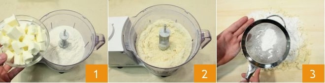 Para realizar las tartaletas con crema frangipane y mermelada de cerezas, comenzad con la preparación de la masa quebrada: en un procesador poned la harina tamizada, una pizca de sal y la mantequilla fría de nevera en cubos 1. Triturad todo hasta obtener una mezcla de aspecto arenoso y harinoso 2; verted la mezcla obtenida sobre una superficie de trabajo (o en un bol), formad un hueco en el centro y añadid el azúcar glas tamizado 3.
