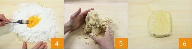 Verted las yemas, luego comenzad a mezclar todo con un tenedor 4. Cuando los huevos hayan absorbido la harina, podéis continuar a mano: amasad brevemente, solo el tiempo necesario para compactar la masa 5 para que la masa quebrada no se caliente demasiado con el calor de las manos y permanezca quebradiza. Formad una bola, aplastadla para que se enfríe más fácilmente y envolvedla en film transparente 6, guardándola en la nevera al menos 30 minutos.