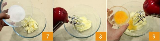 Mientras tanto, podéis preparar la crema frangipane: en un bol, verted la mantequilla a temperatura ambiente cortada en trozos y el azúcar 7. Trabajad con una batidora eléctrica equipada con varillas 8 y, cuando la mezcla esté bien montada, añadid un huevo a la vez 9, esperando que el anterior se haya incorporado y continuando con las varillas.
