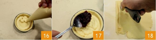 Pasad entonces al relleno: con la ayuda de la manga pastelera, llenad aproximadamente 1 cm del fondo de las tartaletas con la crema frangipane 16 y luego terminad con la mermelada de cerezas, llenando el molde hasta el borde 17. Pasad luego a la decoración: extendéd la masa quebrada que habéis reservado a un grosor de 4 mm y luego con una rueda cortapastas dentada, sacad tiras de 1 cm de grosor 18.