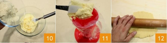 Recoged la mezcla de los lados con una espátula y finalmente añadid la harina de almendra 10, luego colocad la crema en una manga pastelera sin boquilla, guardándola en la nevera 11. Pasado el tiempo necesario, con el rodillo, extendéd la masa quebrada a un grosor de aproximadamente 1 cm 12.
