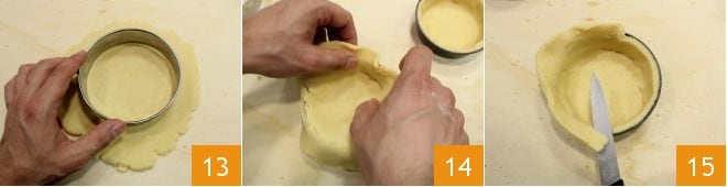 Con un cortador de pasta de 14 cm de diámetro, sacad 4 discos 12 y con estos forrad 4 moldes redondos antiadherentes, previamente enmantequillados y enharinados, de 10 cm de diámetro y con un borde de 3 cm de alto 14; presionad ligeramente con los dedos el fondo y los bordes para que la masa se adhiera bien y luego con un cuchillo eliminad el exceso de masa, conservando la masa que ha sobrado 15. Si queréis realizar una única tarta, podéis usar un molde de 28 cm de diámetro con un borde de 4 cm de alto.