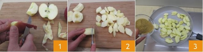 Para preparar la sbriciolata de manzana con salsa de chocolate, comenzad ocupándoos de las manzanas. Lavarlas, pelarlas 1, cortarlas primero en gajos y luego en rodajas por el lado más corto 2. Transferid las manzanas a una cacerola, añadid el azúcar moreno 3