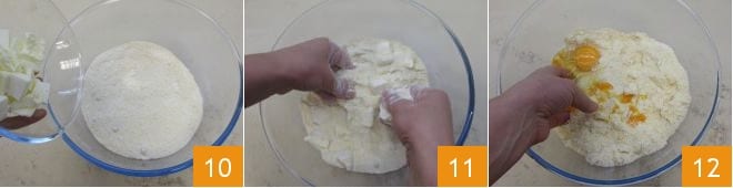 Por último, agregad la mantequilla cortada en cubos 10 fría del frigorífico e iniciad a amasar pellizcando rápidamente la masa 11 para no calentarla demasiado. Añadid la yema y el huevo entero 12