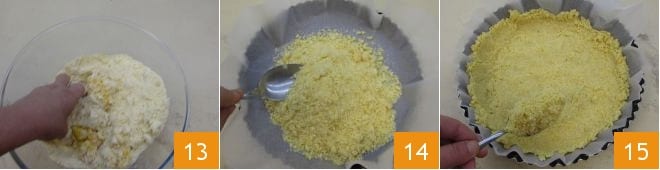 y continuad amasando 13 hasta obtener una mezcla desmenuzable. Transferid un poco más de la mitad de la masa a un molde de 22 cm forrado con papel de horno 14 y presionando suavemente con el dorso de una cuchara, extenderla sobre toda la superficie, incluidos los bordes 15.