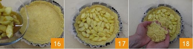 Vertid las manzanas dentro del molde 16, distribuidlas de manera uniforme 17 y cubrid con la parte restante de la masa 18.