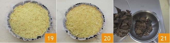 Esta vez no será necesario presionar con la cuchara, sino simplemente cubrir toda la superficie con las migas, sin dejar espacios vacíos 19. Coced la sbriciolata en horno estático precalentado a 180° durante 30 minutos (o en horno ventilado precalentado a 160° durante unos 25 minutos). Sacad el pastel del horno 20, dejadlo templar y mientras tanto, preparad la salsa de chocolate. Picad el chocolate negro en trozos grandes y fundidlo 21 al baño maría, removiendo con frecuencia.