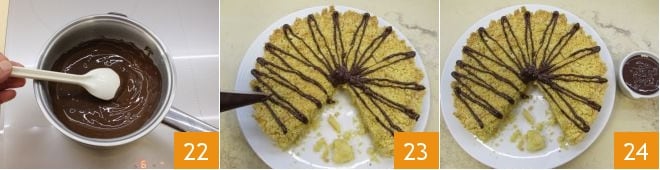 Una vez que el chocolate esté completamente fundido 22, transferid una parte a una manga pastelera y decorad vuestro pastel, según vuestro gusto 23. Servid la sbriciolata de manzana con la salsa de chocolate restante 24.