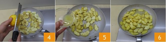 la cáscara de media naranja 4 y el jugo 5. Dejad cocinar de esta manera durante unos 10 minutos a fuego lento: las manzanas no deben deshacerse sino permanecer crujientes 6. Luego, transferidlas a un bol y dejadlas enfriar.