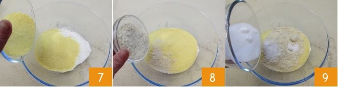 Ahora pasad a preparar la sbriciolata: unid en un bol la harina de trigo, la harina de maíz 7, la harina de almendras 8 y el azúcar 9.