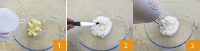 Para preparar los cupcakes optical, colocad en un recipiente el azúcar junto con la mantequilla blanda a temperatura ambiente cortada en trozos 1. Abrid la vaina de vainilla a lo largo; extraed las semillas rascando con un cuchillo y añadidlas al bol 2 junto con una pizca de sal. Empezad a trabajar los ingredientes hasta obtener una crema 3