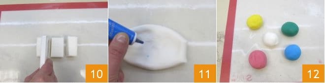 Mientras tanto, podéis preparar las decoraciones con el fondant: con una espátula divididlo en pequeños bloques 10, haced un pequeño hueco y verted los colorantes alimentarios que queráis según el tono que queráis obtener 11; amasad bien con las manos para que la coloración sea uniforme 12.
