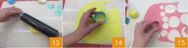 Espolvoread ligeramente con azúcar glas el tapete de silicona y extendid el fondant amarillo 13 en un disco fino y cortad discos de 6 cm de diámetro 14, luego extendid el fondant rosa y repetid la operación para el rosa usando tanto el cortador de pasta de 6 cm como uno de tamaño más pequeño (3 cm) 15; proceded de la misma manera con el fondant azul y cortad discos de 5 cm de diámetro.