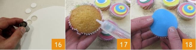 Por último, el blanco y cortad los discos de 3 cm de diámetro 16 y colocad todos los discos en una bandeja forrada con papel de horno. Cuando los cupcakes estén cocidos y completamente fríos, decorad con los discos de fondant pegándolos con pegamento alimentario 17; colocad el primer disco de fondant coloreado 18