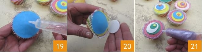 y luego distribuid el pegamento alimentario 19 y continuad colocando los discos de diferentes tamaños y colores 20; podéis terminar decorando con lápices brillantes de colores 21. ¡Vuestros cupcakes optical están listos para ser los protagonistas de vuestros buffets!