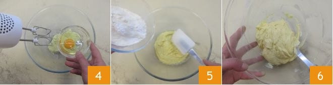 luego incorporad los huevos uno a uno, continuando con las varillas 4. En un bol aparte tamizad la harina y la levadura, y añadid los ingredientes secos a la mezcla de mantequilla, huevos y azúcar 5 y mezclad bien todos los ingredientes con una espátula, hasta obtener una masa lisa y homogénea 6.