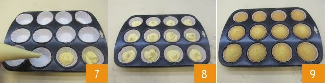 Verted la masa que habéis obtenido en una manga pastelera sin boquilla a la que podéis hacer un agujero; forrad un molde para muffins con 12 cápsulas de papel y con la ayuda de la manga pastelera llenadlas hasta la mitad con la masa (7-8). Hornead en horno estático precalentado a 180°C durante 20 minutos (o a 160°C durante 10-15 minutos si es en horno ventilado) hasta que los cupcakes estén ligeramente dorados en la superficie. Una vez listos 9, apagad el horno y dejad que se enfríen completamente.