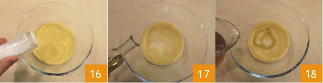 Mientras tanto, prepara el cuscús: en el bol con el cuscús añade una pizca de sal 16, el aceite 17 y el caldo de verduras caliente para cubrir 18.