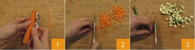 Para preparar el cuscús frío de pollo, empieza preparando el Caldo de verduras (te recomendamos preparar unos 300 g, ya que lo necesitarás tanto para el cuscús como para cocinar las verduras). Luego, corta y pela las zanahorias 1, después córtalas en tiras y luego en dados pequeños 2; lava y corta también los calabacines y córtalos en dados intentando hacer piezas todas iguales y del mismo tamaño que las zanahorias 3.