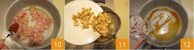 salpimenta y aromatiza con pimentón dulce 10; deja cocinar removiendo con frecuencia durante unos 5-7 minutos, hasta que tenga una bonita costra dorada. Una vez listo, reserva el pollo 11 y en la misma sartén con el fondo de cocción del pollo, añade el chalote 12