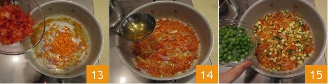 agrega también las zanahorias y los pimientos 13, y deja cocer durante 4 minutos a fuego alto, añadiendo uno o dos cucharones de caldo de verduras que ayudarán con la cocción 14; después añade los calabacines y los guisantes 15 y cocina las verduras por otros 4 minutos aproximadamente, añadiendo caldo de verduras si es necesario. Las verduras deben ablandarse pero no deshacerse.