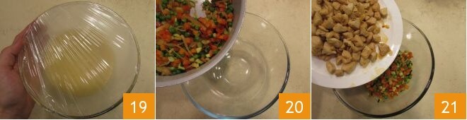 Cubre con papel film y deja que el cuscús se hinche: tardará unos 5 minutos. Una vez listas las verduras y enfriadas 20, viértelas en el bol, añade el pollo también frío 21