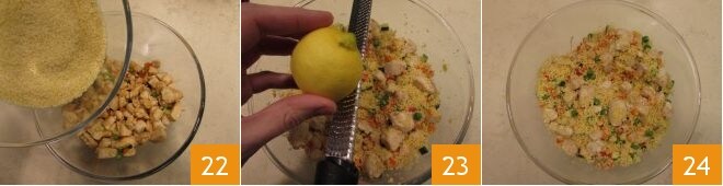 luego añade también el cuscús que mientras tanto se habrá hinchado 22; aromatiza con la ralladura de limón sin tratar 23 que aportará frescura al plato. ¡Tu cuscús frío de pollo está listo para ser servido 24!